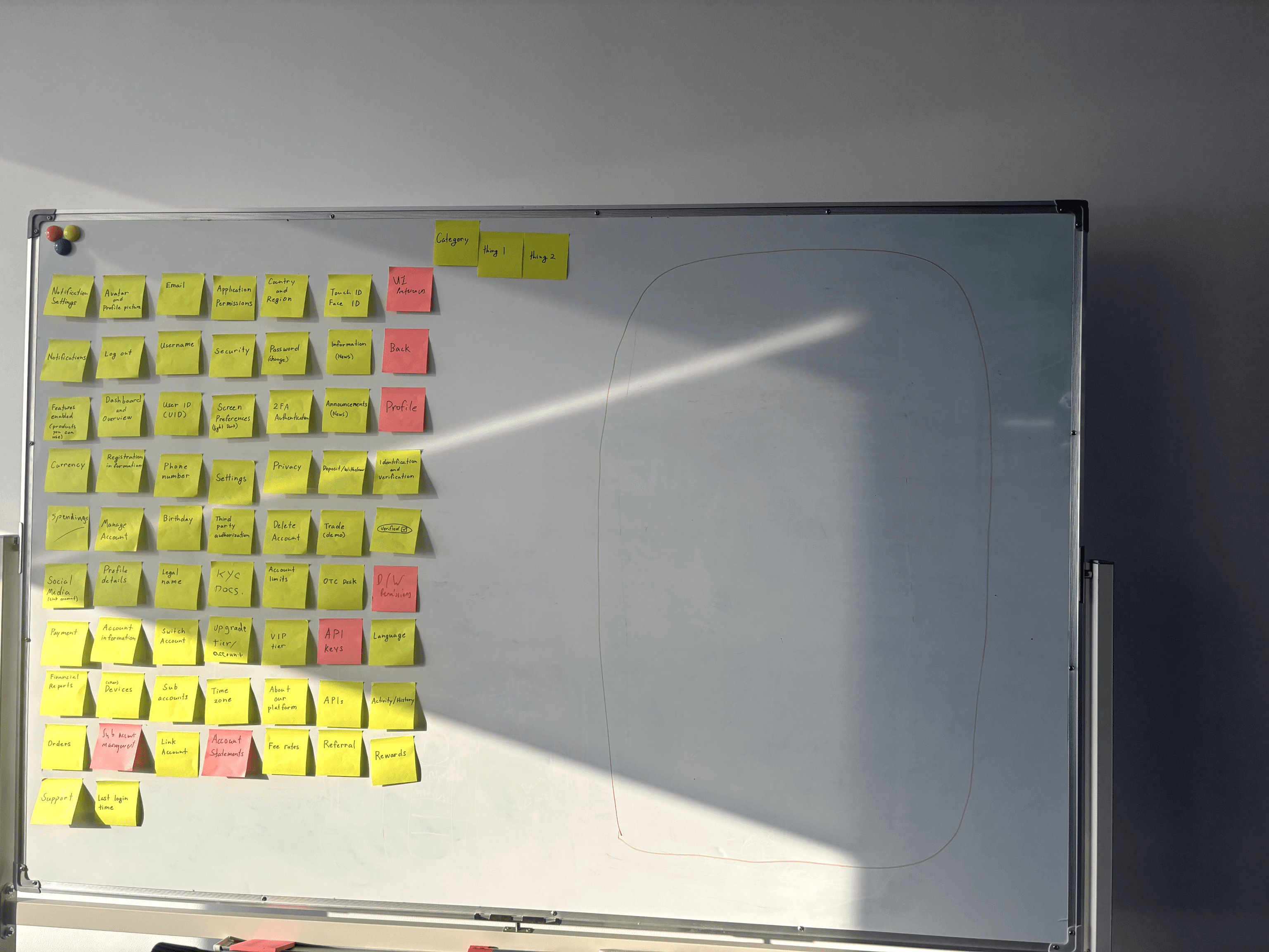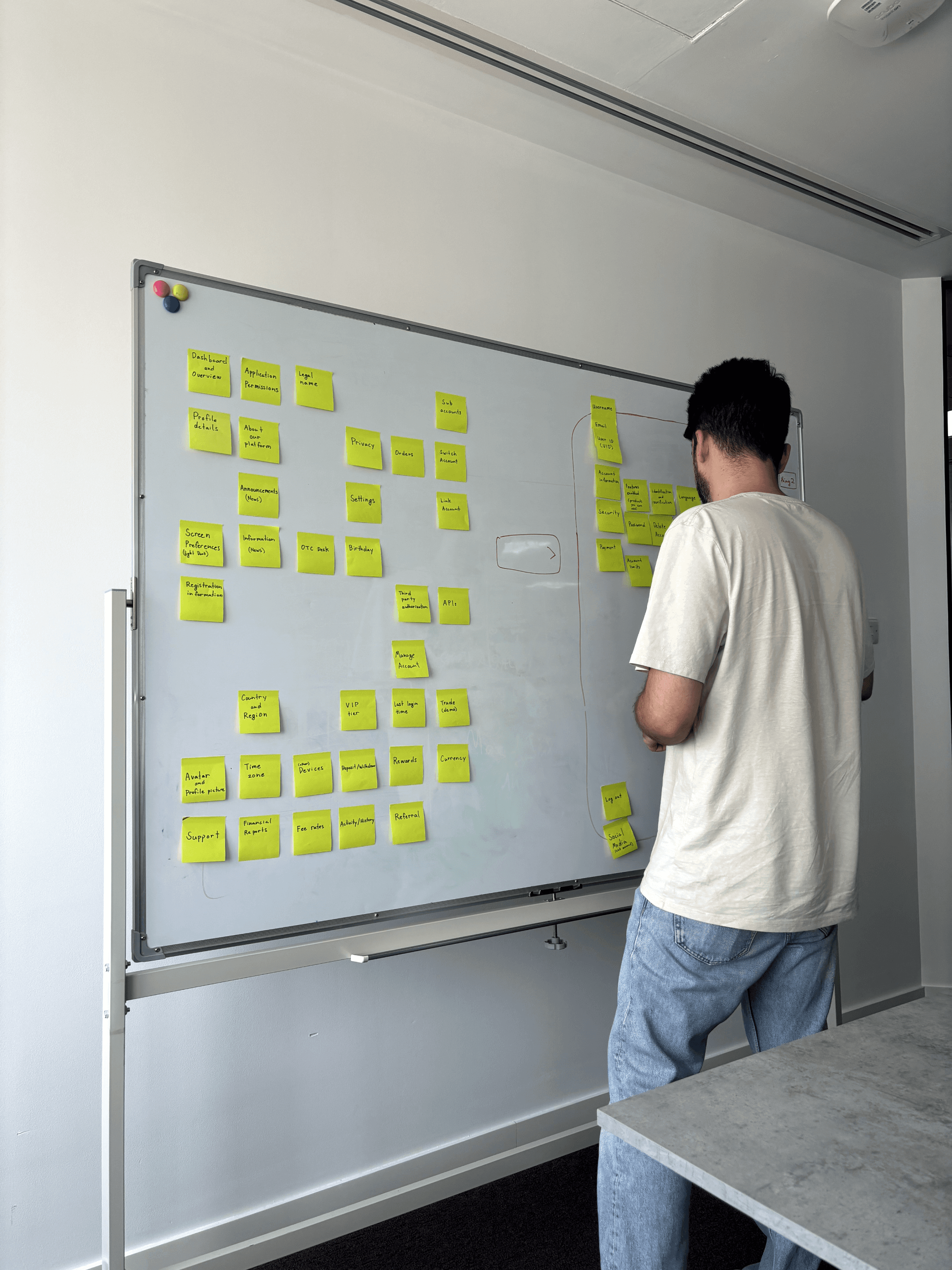 プロフィールセクションをどのように構成することを想定しているかを把握するため、15名の参加者を対象にカードソーティングを実施しました。ベンチマーキング段階で作成したカテゴリを使用し、参加者はプロフィール要素を表すカードを論理的なグループに分類しました。用意されたカードだけではアイデアを十分に表現できない場合は、参加者自身でカードを作成することもできました。ビジュアルでは、ソーティング前の初期設定、ソーティングに参加している様子、そしてソーティング完了後の最終的な配置を示しています。