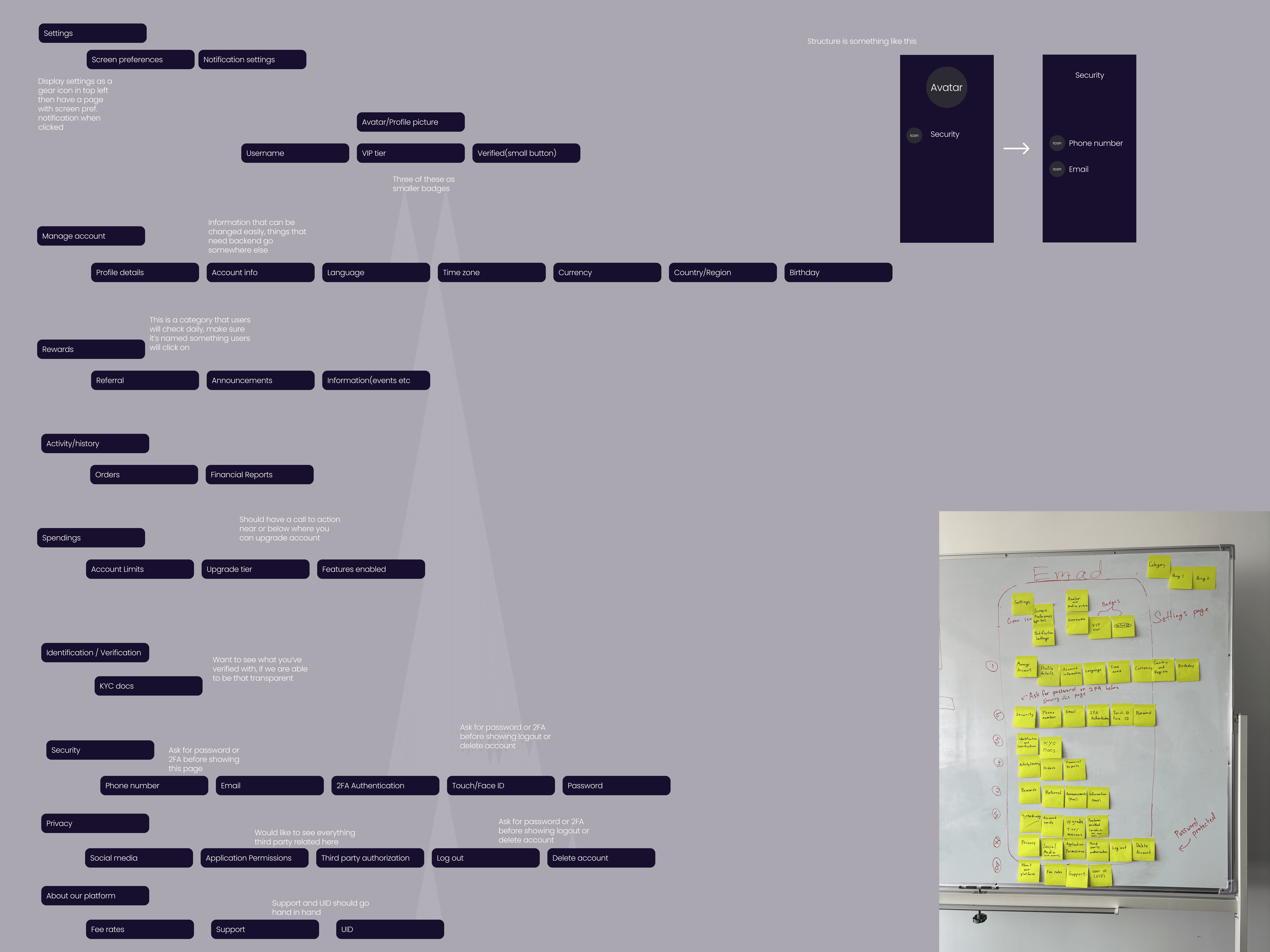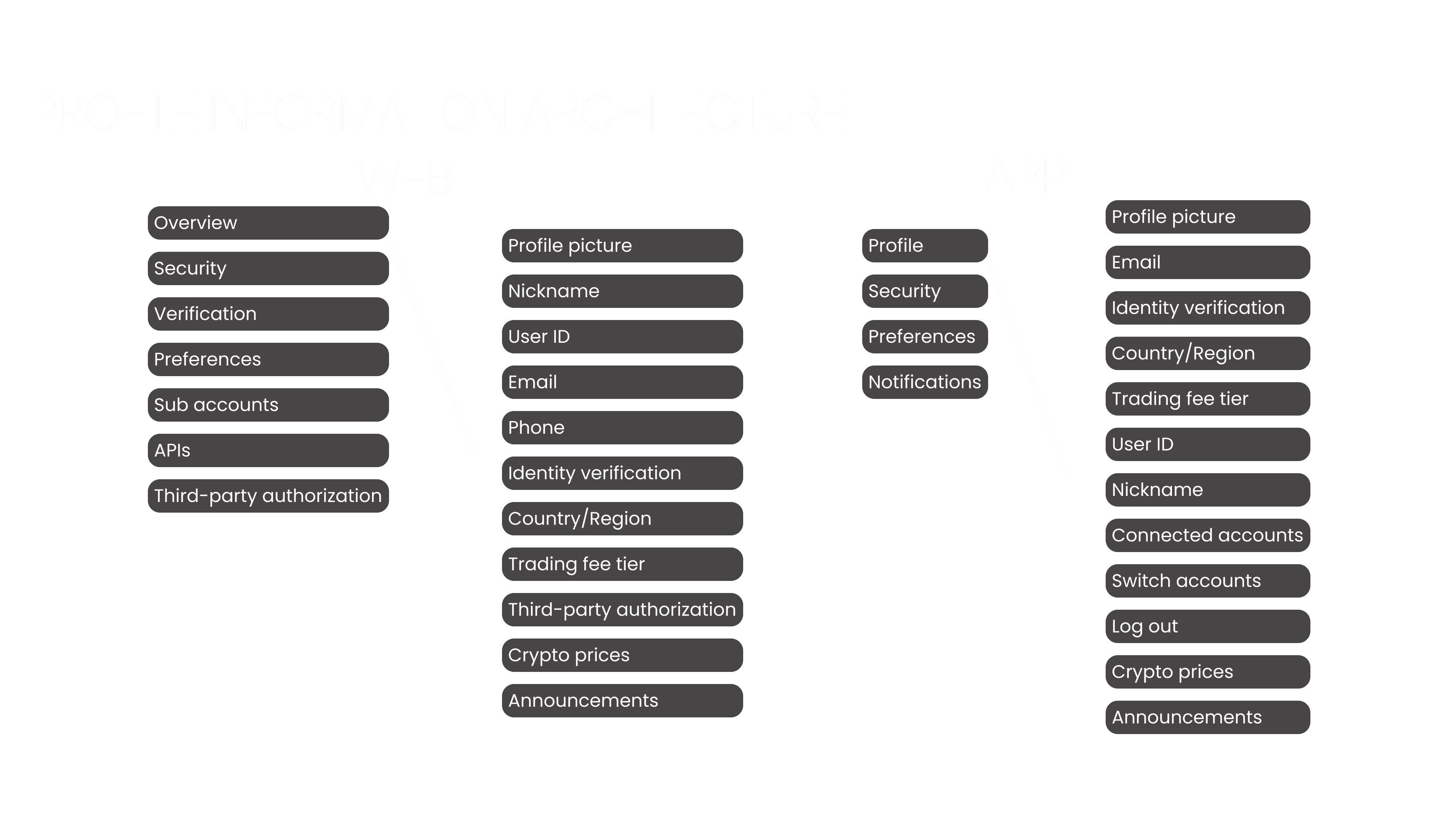 初期フェーズではベンチマーキングを実施し、7つの類似プラットフォームを分析して、プロフィールセクション内のカテゴリーや構造を評価しました。これには、他のプロフィールに存在していてデザインに欠けていた機能の記録に加え、デザインには含まれている一方で他のプロフィールにはない要素の整理も含まれます。さらに、情報アーキテクチャの視覚的な図も作成しました。このプロセスの目的は、業界標準を把握し、より直感的なユーザー体験を生み出すことでした。