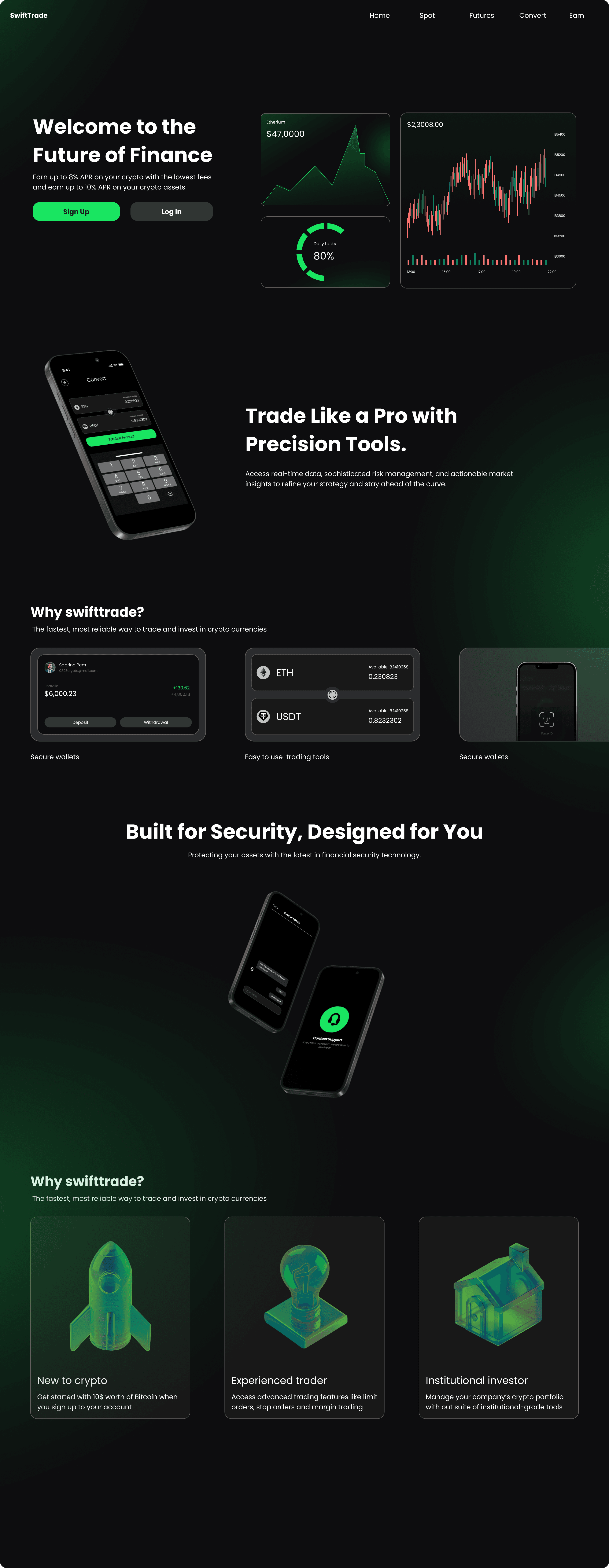 暗号資産プラットフォームのランディングページのWeb画面では、クリーンで視覚的に魅力的なレイアウトを通じて、プラットフォームの主要機能とサービスをユーザーに紹介しています。直感的なナビゲーションにより、重要な情報や操作へスムーズに導きながら、サインアップやアカウント管理オプションにも簡単にアクセスできます。すべてのグラフィック素材とビジュアル要素は、統一感がありブランドらしさのある体験を実現するために制作されています。