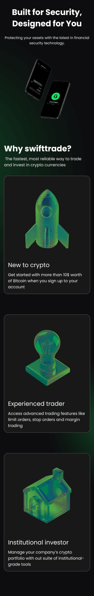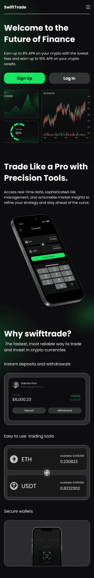 暗号資産プラットフォームのランディングページのモバイル版は、最適化されたナビゲーションと主要機能への簡単なアクセスを備えたレスポンシブデザインを提供し、Web版との視覚的な一貫性を維持しています。スクロール可能なプロトタイプをご用意しており、操作しながらレイアウトをご確認いただけます。