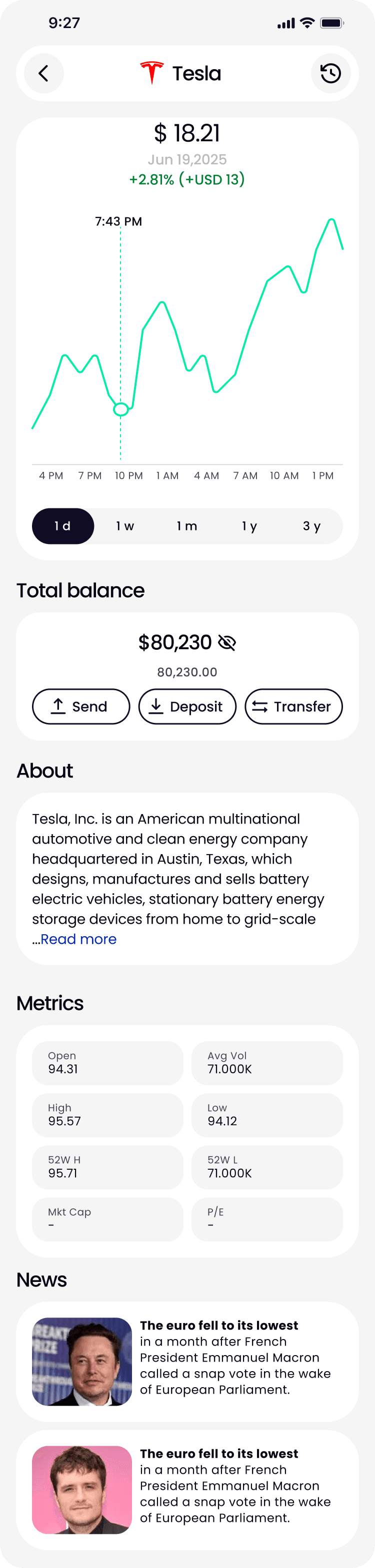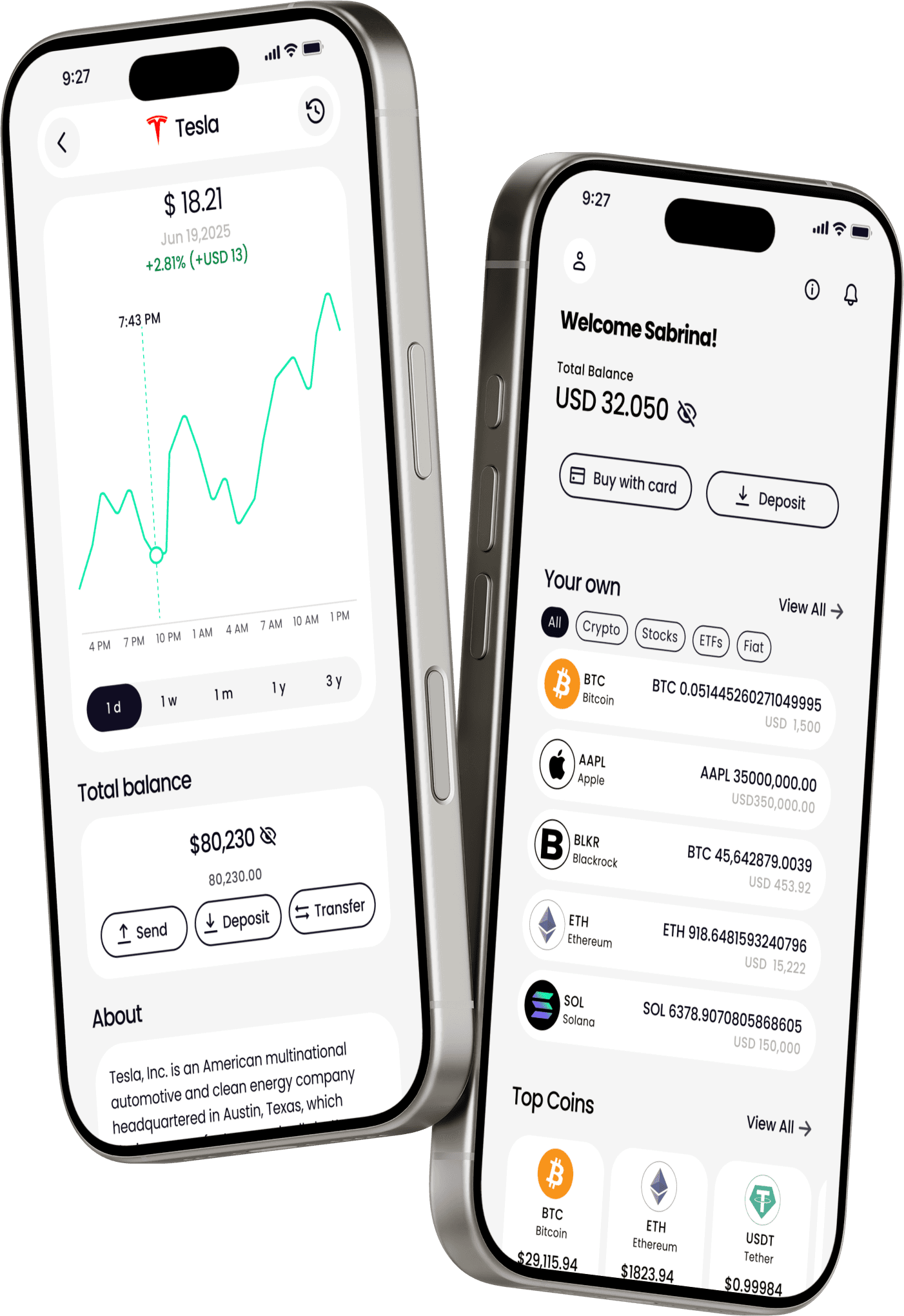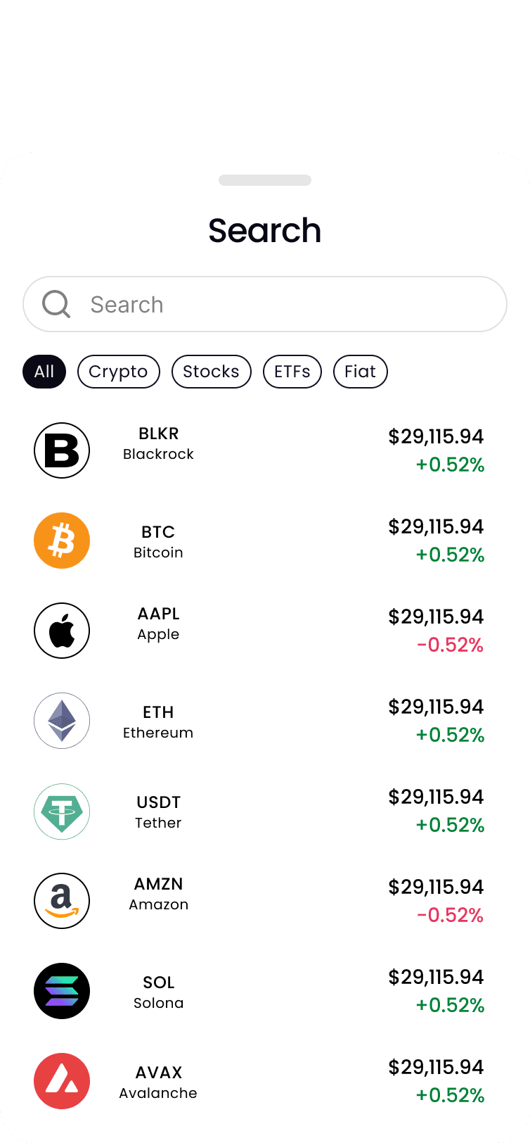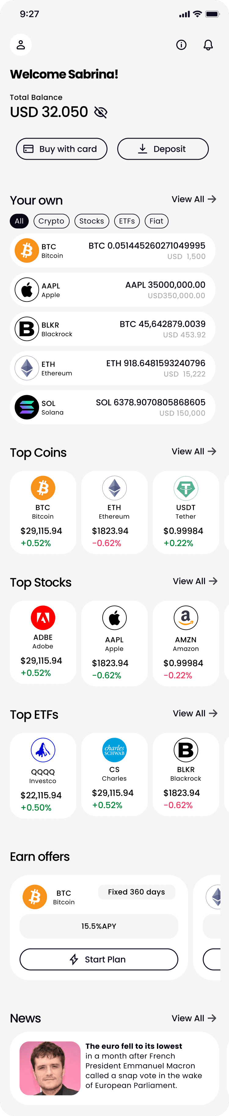 このデザインには、株式、ETF、暗号資産のリアルタイムデータを表示するダッシュボードが含まれています。