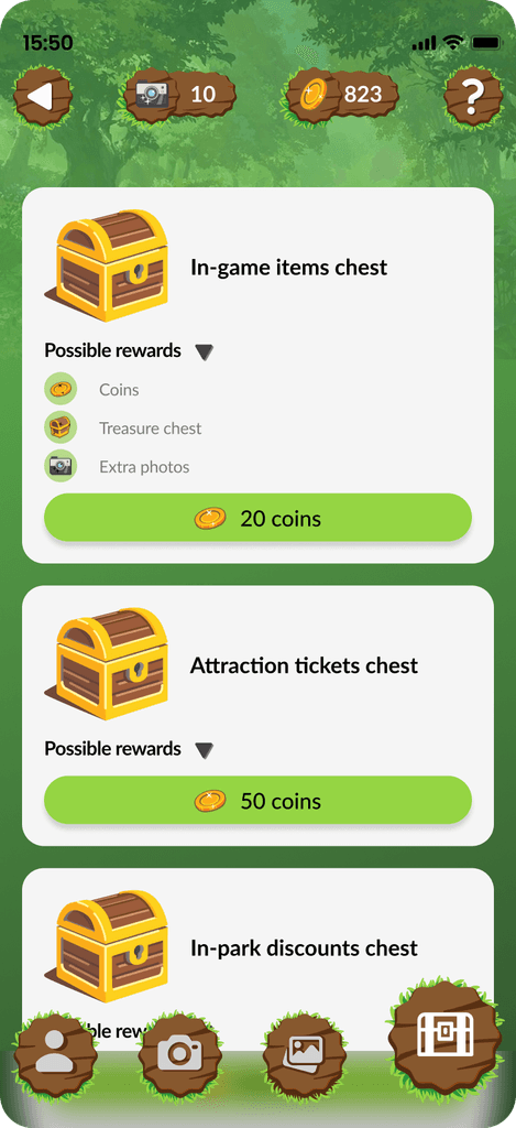 A screen to exchange your coins for treasure chests. To save screen space, the potential rewards can be collapsed.